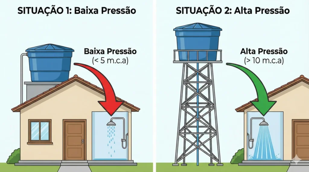 - Baixa Pressão (menos de 5 M.C.A.): Comum em casas térreas e sobrados onde a caixa fica logo acima da laje do banheiro. A gravidade não tem força suficiente para empurrar a água com vigor.