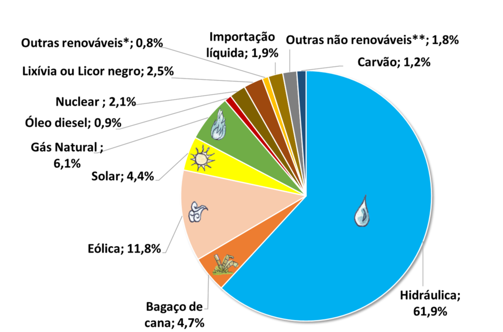 A matriz energética do Brasil é diversificada e tem se desenvolvido ao longo do tempo, refletindo tanto o potencial natural do país quanto as estratégias de políticas públicas. A geração de energia elétrica no Brasil é predominantemente baseada em fontes renováveis, com destaque para as hidrelétricas, que até hoje representam a maior parte da capacidade instalada. Aproximadamente 60% da energia elétrica gerada no Brasil provém dessas instalações, aproveitando os vastos recursos hídricos disponíveis, especialmente na região amazônica e no Sul do país.