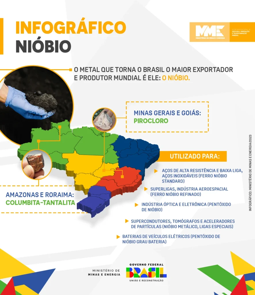 Em 2022, a produção de nióbio no Brasil gerou mais de R$137 milhões, posicionando-se como o primeiro produtor global do mineral. De acordo com o governo brasileiro, o Brasil possui uma cadeia produtiva desse metal, possibilitando a exportação e utilização interna de subprodutos da extração. Segundo dados do setor privado, a cadeia de extração e processamento do nióbio cria mais de 7 mil postos de trabalho diretos no país.